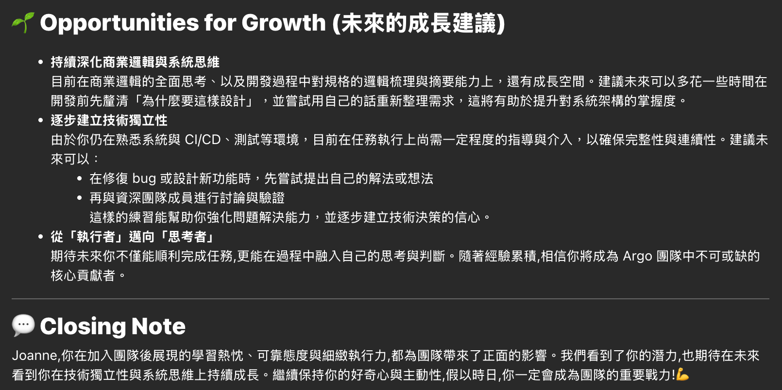 Through these experiences, and the feedback I received from teammates, I started to see that I am the one doing the work. Even though I still have a lot to strengthen—like deepening my technical fundamentals and not relying too heavily on AI tools—I’m proud of the direction I’m heading.